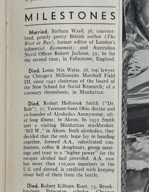 Time Magazine – November 27, 1950 Featuring the Death Notice of Dr. Bob Smith, Co-Founder of Alcoholics Anonymous Publication: TIME – The Weekly Ne...
