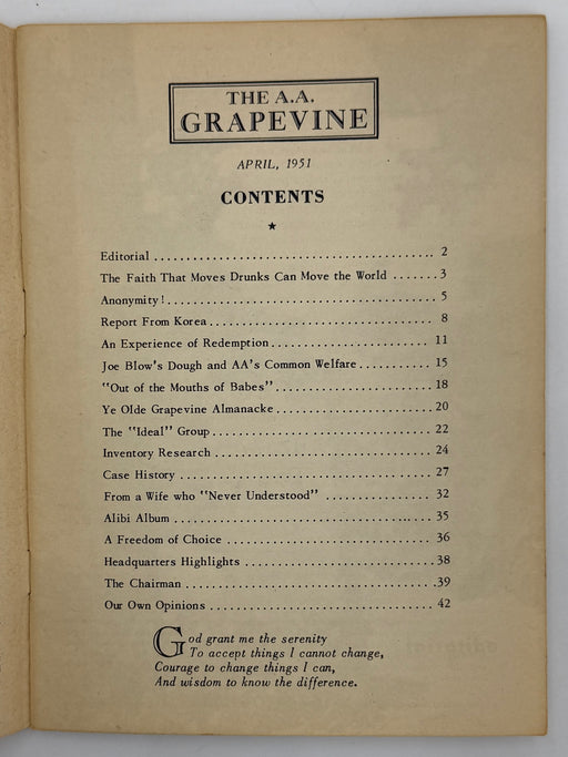 Original price $150 - Original price $150Original price$150$150 - $150Current price $150This is the April 1951, issue of the AA Grapevine. This issue features the articles “The Faith That Moves Drunks Can Move The World” by Jack Alexan...