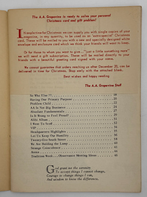Original price $125 - Original price $125Original price$125$125 - $125Current price $125This is the December 1954, issue of the AA Grapevine. This issue features the articles “A Christmas Message from Lois and Bill”, “Home For Christma...