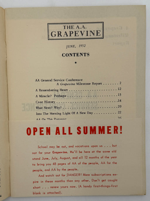 Original price $110 - Original price $110Original price$110$110 - $110Current price $110This is the June 1952, issue of the AA Grapevine. This issue features the articles “AA General Service Conference”, “A Remembering Heart”, “AA on t...