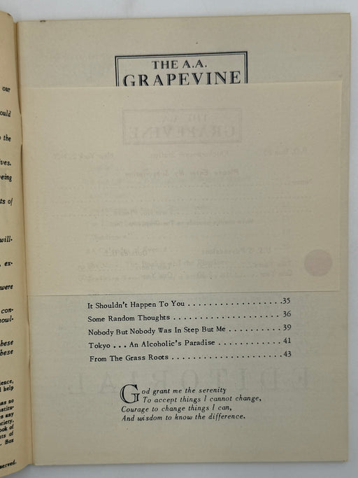 The Grapevine was created by six AA members in the New York area — four women and two men. With the blessings of AA's co-founder Bill W., they published the first issue in June 1944, just nine years after the founding of AA. A copy of that first issue was sent to every AA group — about 300 at the time — and to all known AA members in the armed services overseas. An entire page with the heading, "Mail Call for All AAs in the Armed Forces," was devoted to letters from these members, who began calling the Grapevine their "meeting in print." The title stuck, and today the Grapevine and La Viña carry it on their covers.