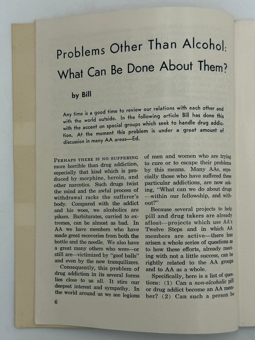A monthly Journal devoted to those seeking further knowledge on the problem of alcoholism, in the hope that it may prove a unifying bond to all alcoholics everywhere. Individual opinions expressed here are not, necessarily, those of AA as a whole.